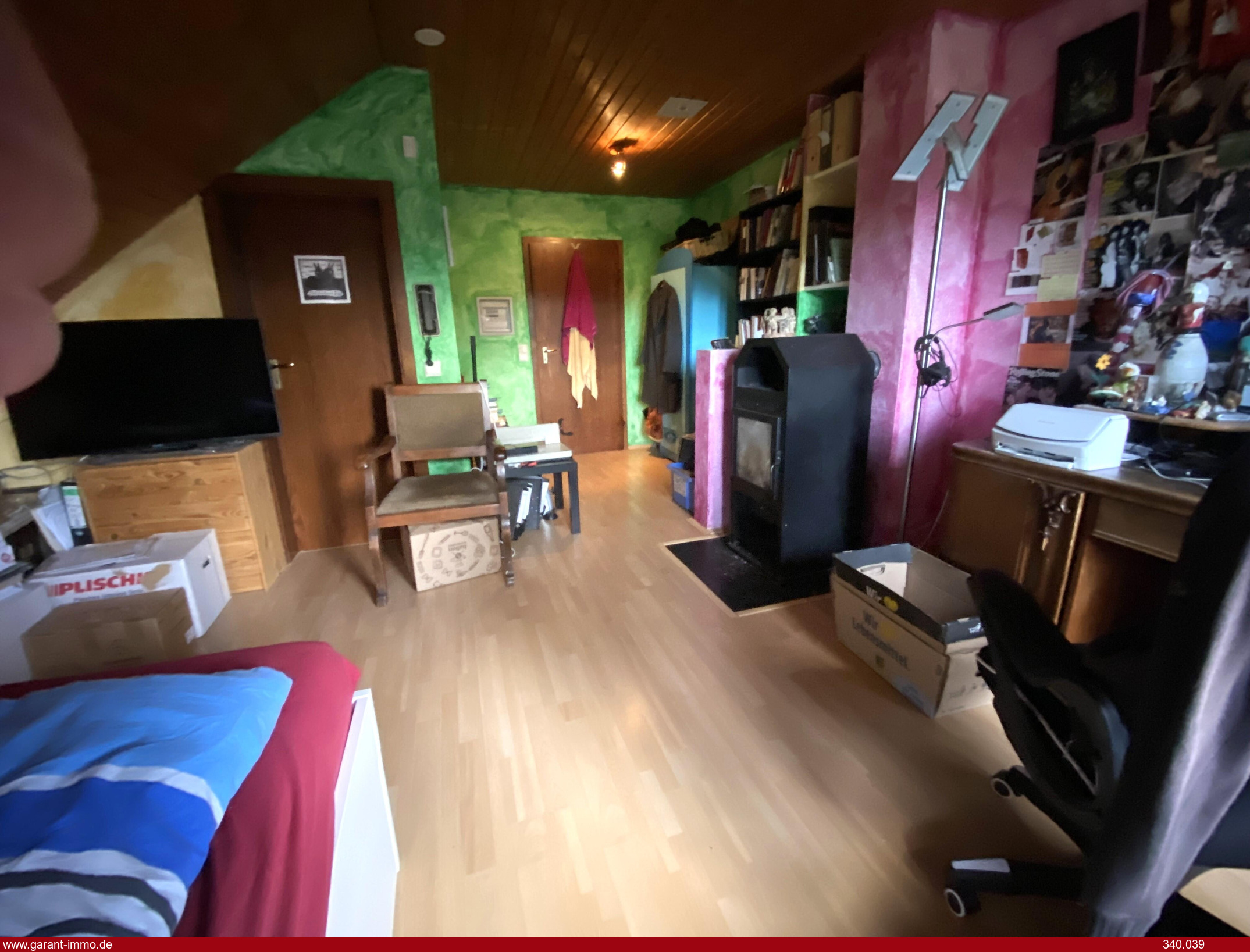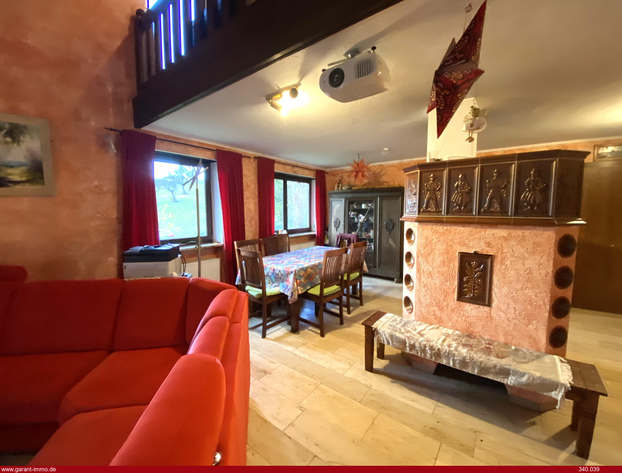 * Ein großes Wohn-/ Esszimmer mit mittigem Kachelofen,