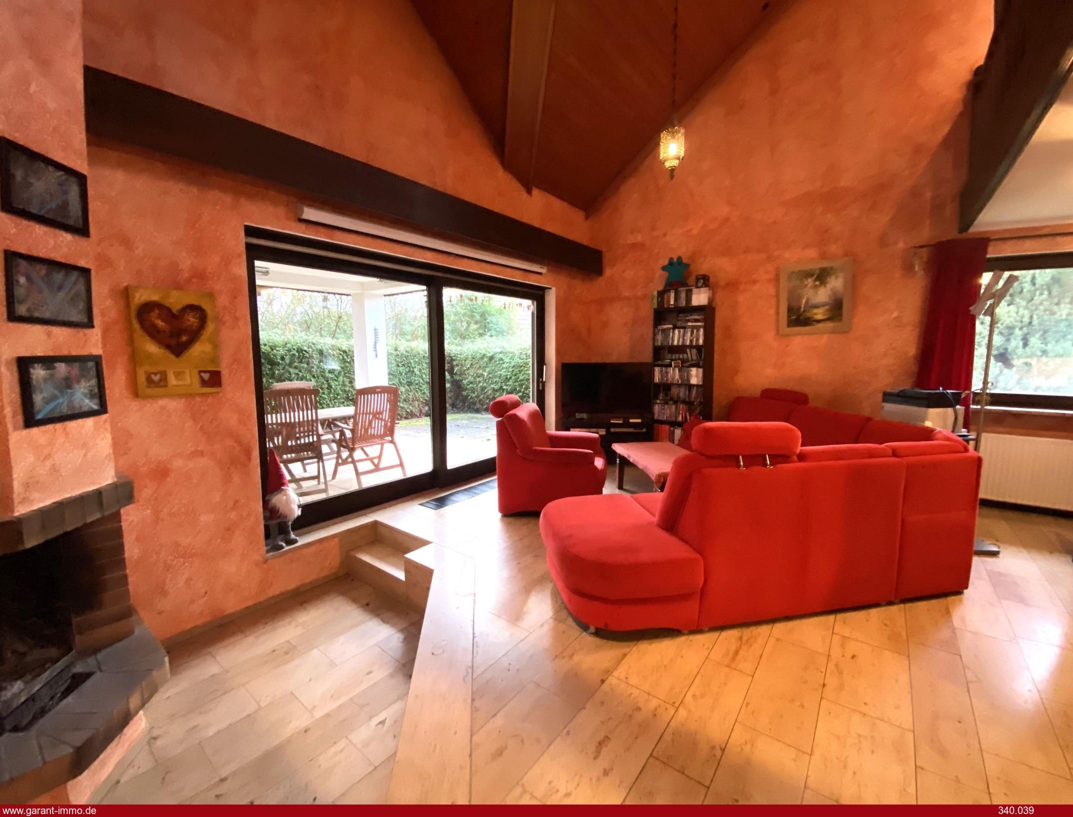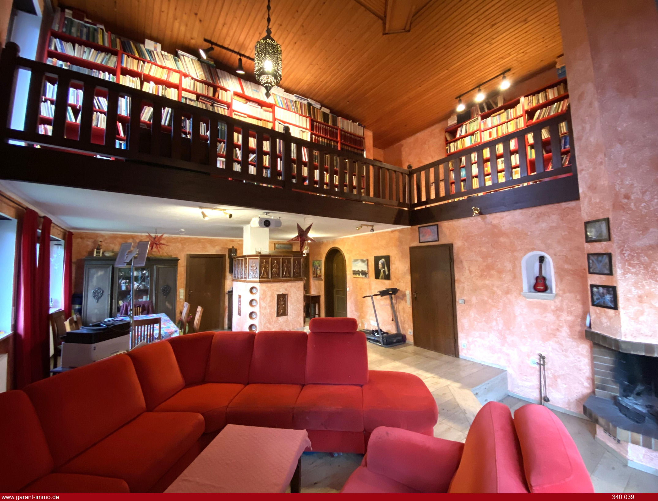 Ein im Wohnbereich mittig positionierter Kachelofen, ein zusätzlicher offener Kamin und eine großzügige, luftige Galerie sorgen für eine angenehme Wohlfühlatmosphäre.