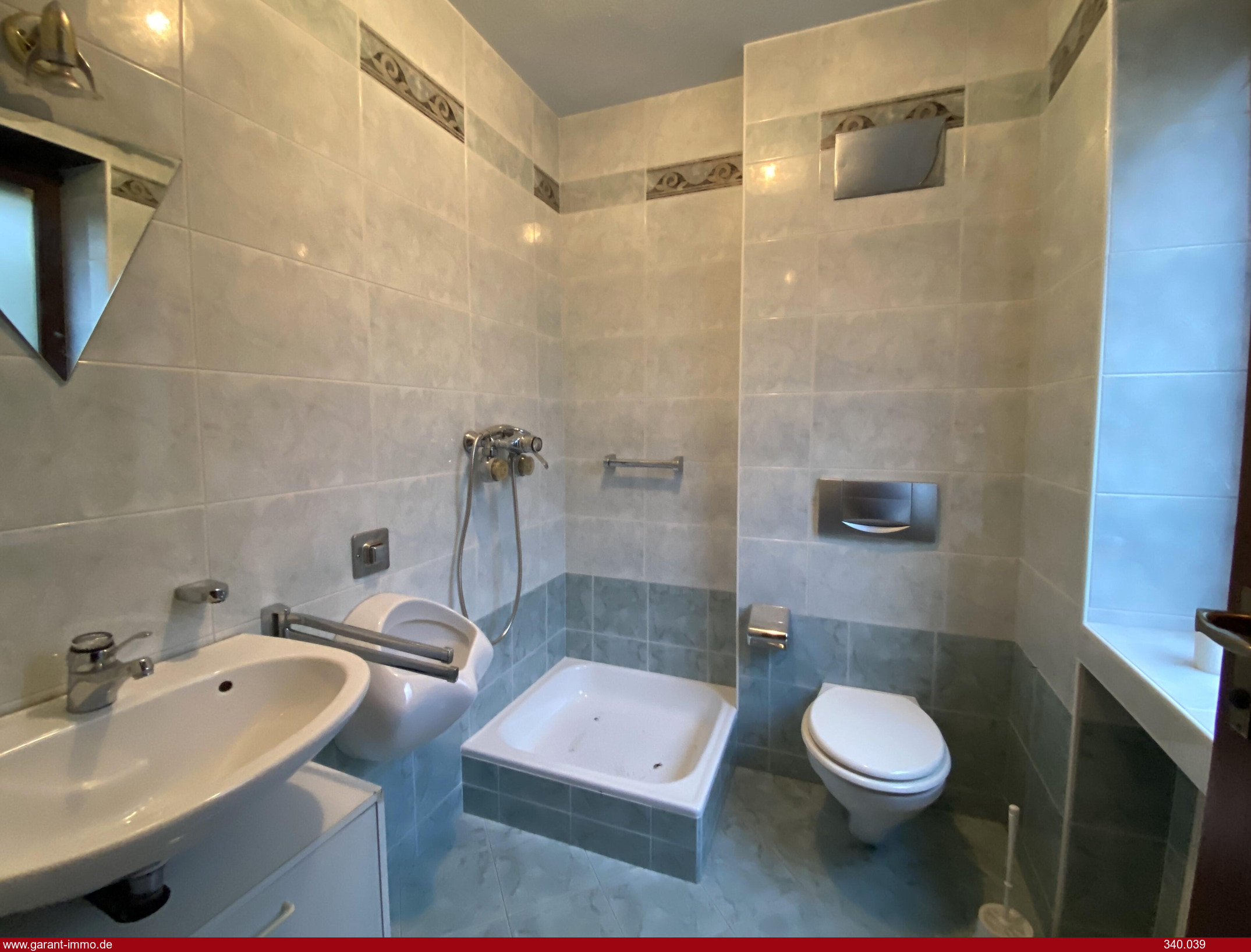 * Ein Tageslicht- Gästebad mit Dusche, WC und Urinal