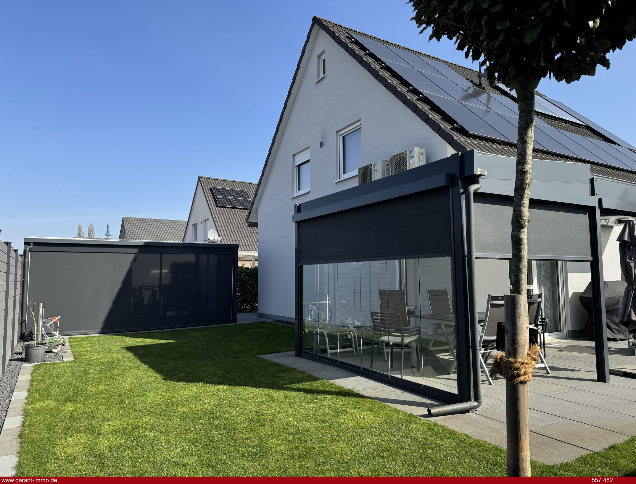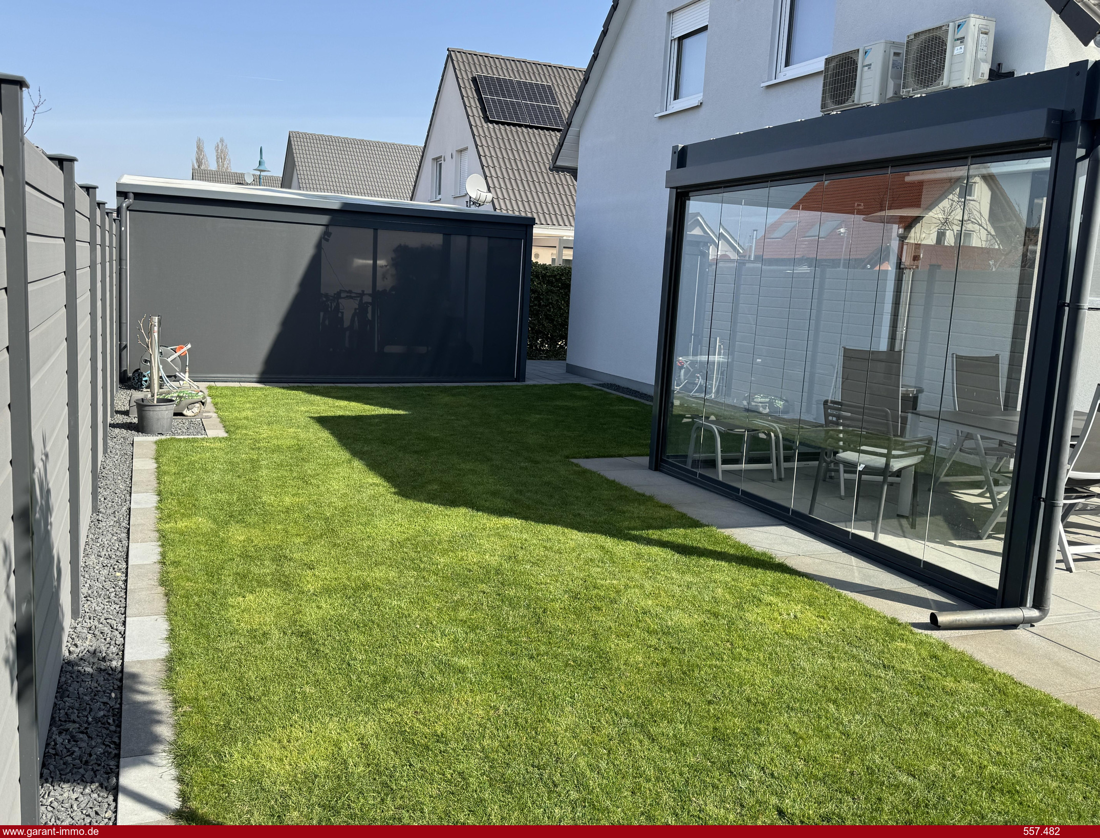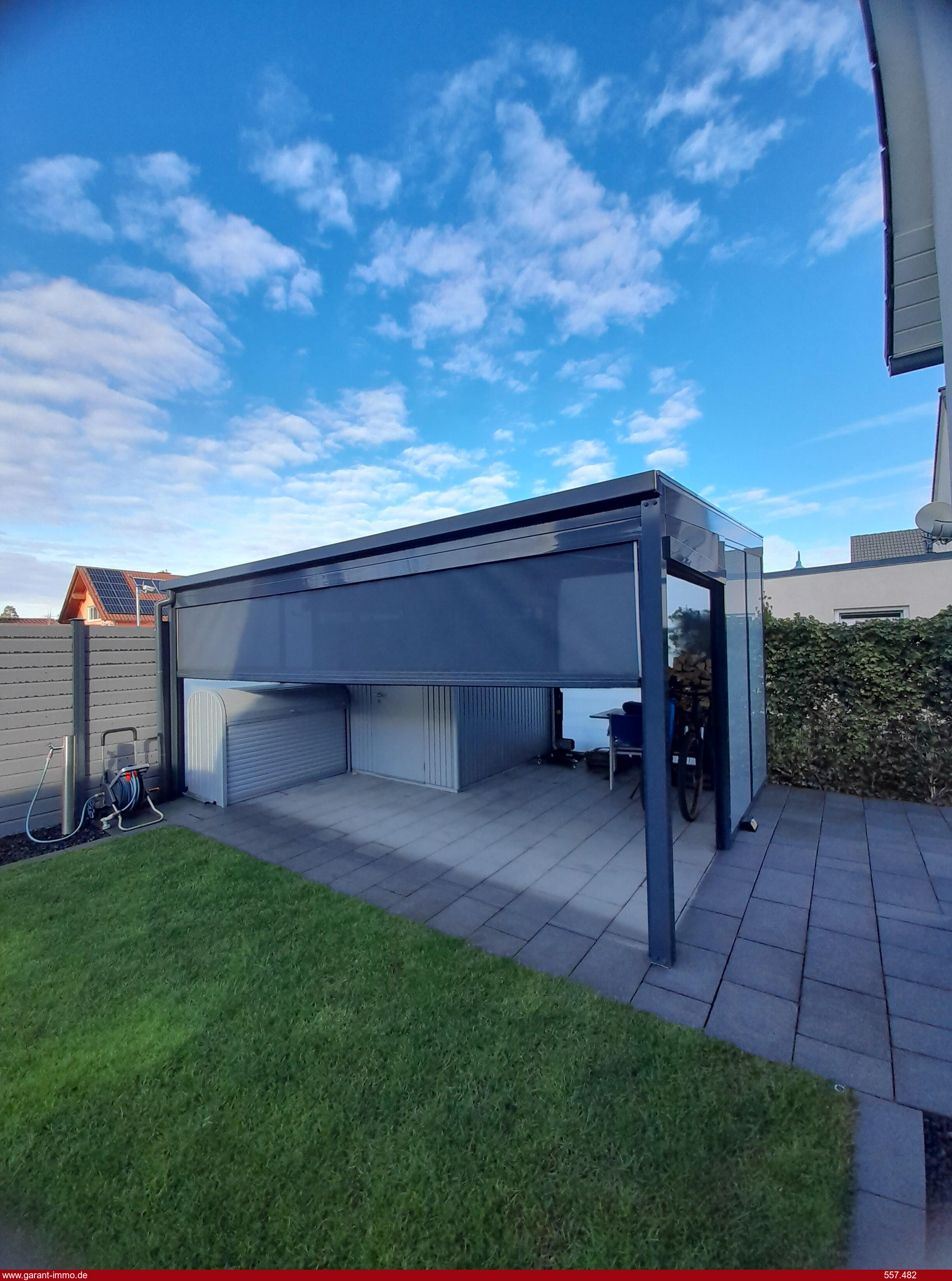 * Terrasse mit Glasüberdachung und Beschattung und seitlichem