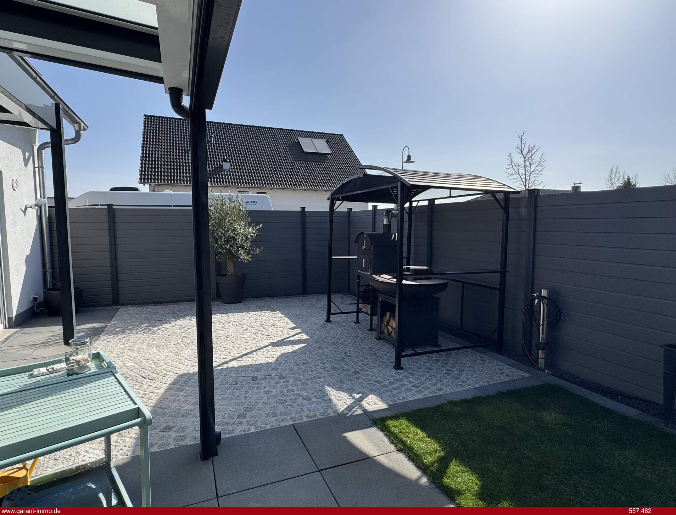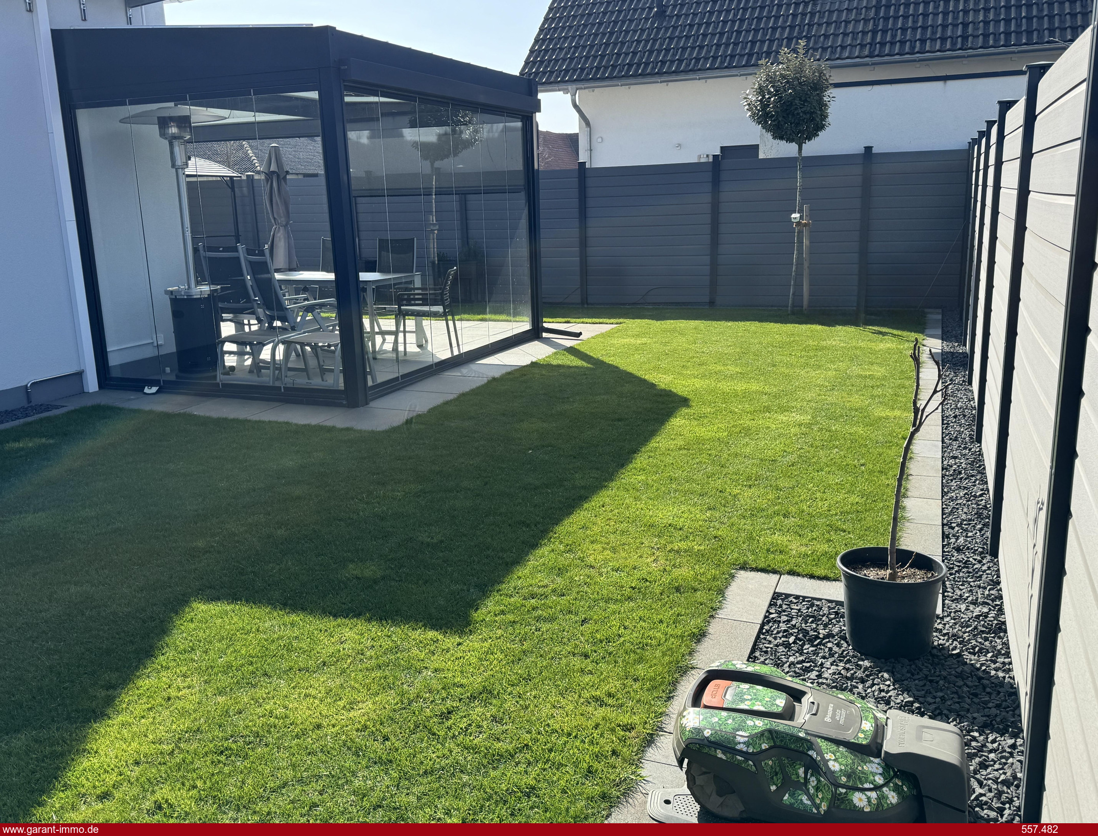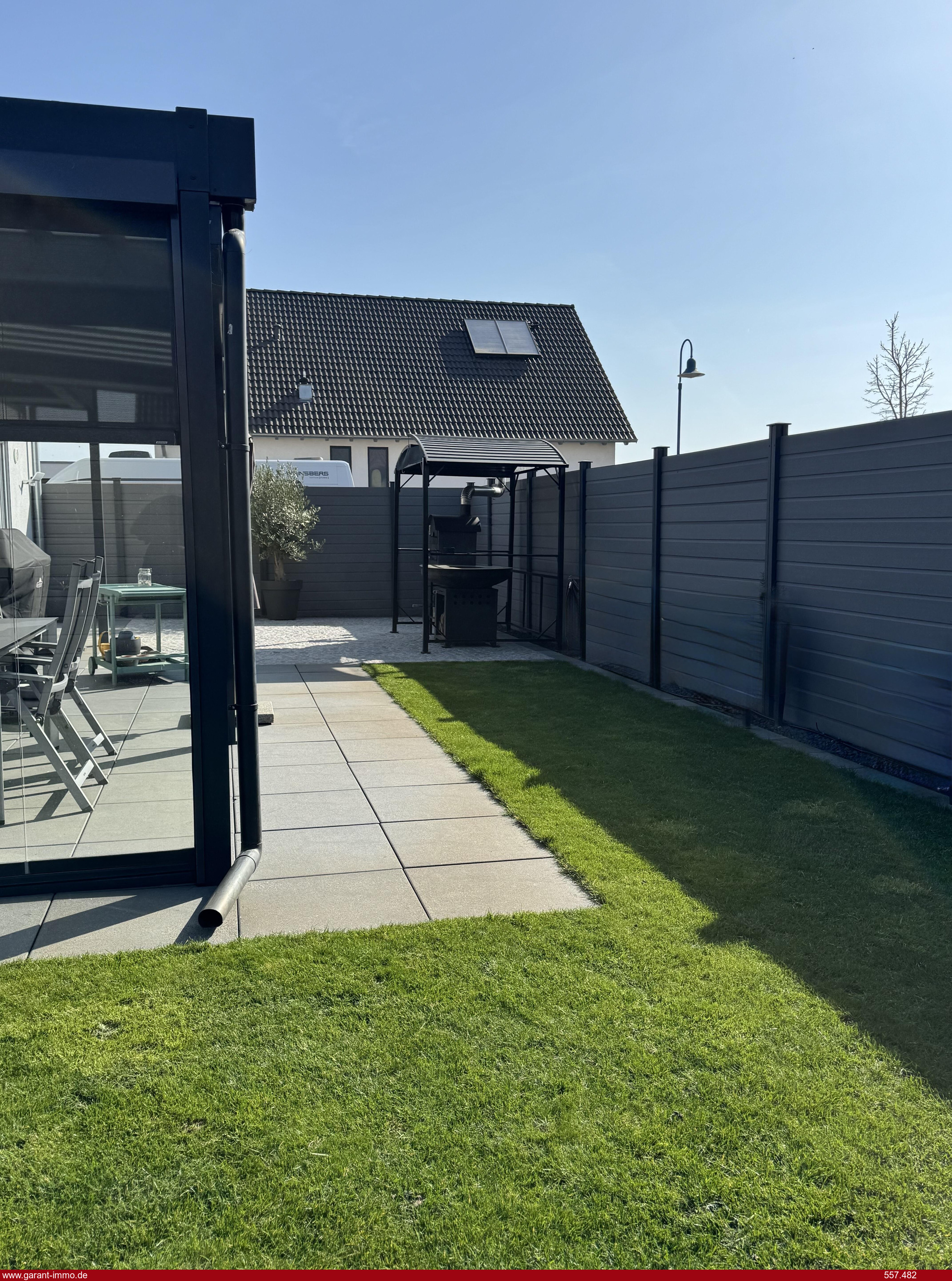 Der liebevoll angelegte Garten bildet eine grüne Oase der Ruhe. Die großzügige Terrasse mit hochwertiger Glasüberdachung lädt zum Entspannen und Verweilen ein. Ergänzt wird der Außenbereich durch ein Gartenhaus mit Glasüberdachung, das ausreichend Platz für Fahrräder sowie zusätzliche Lager- und Abstellmöglichkeiten bietet.