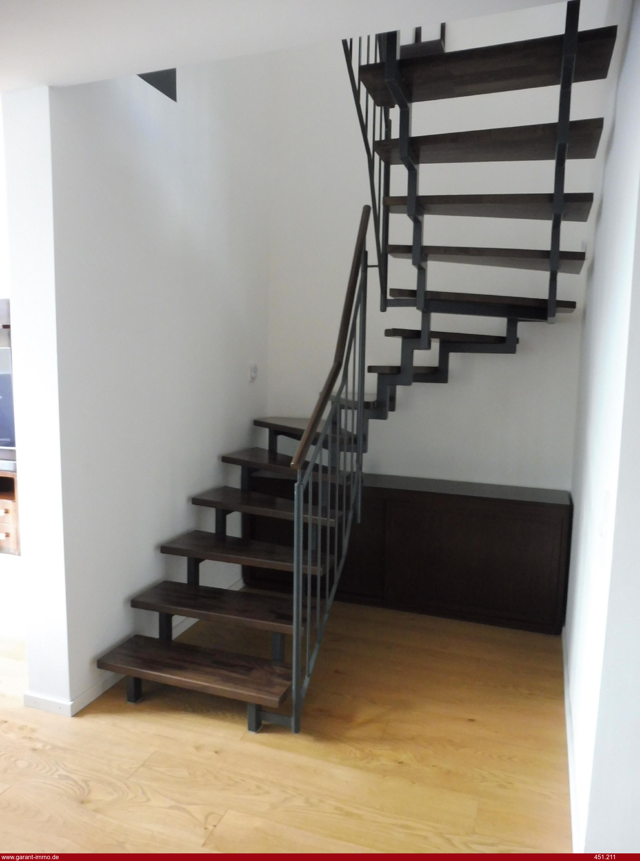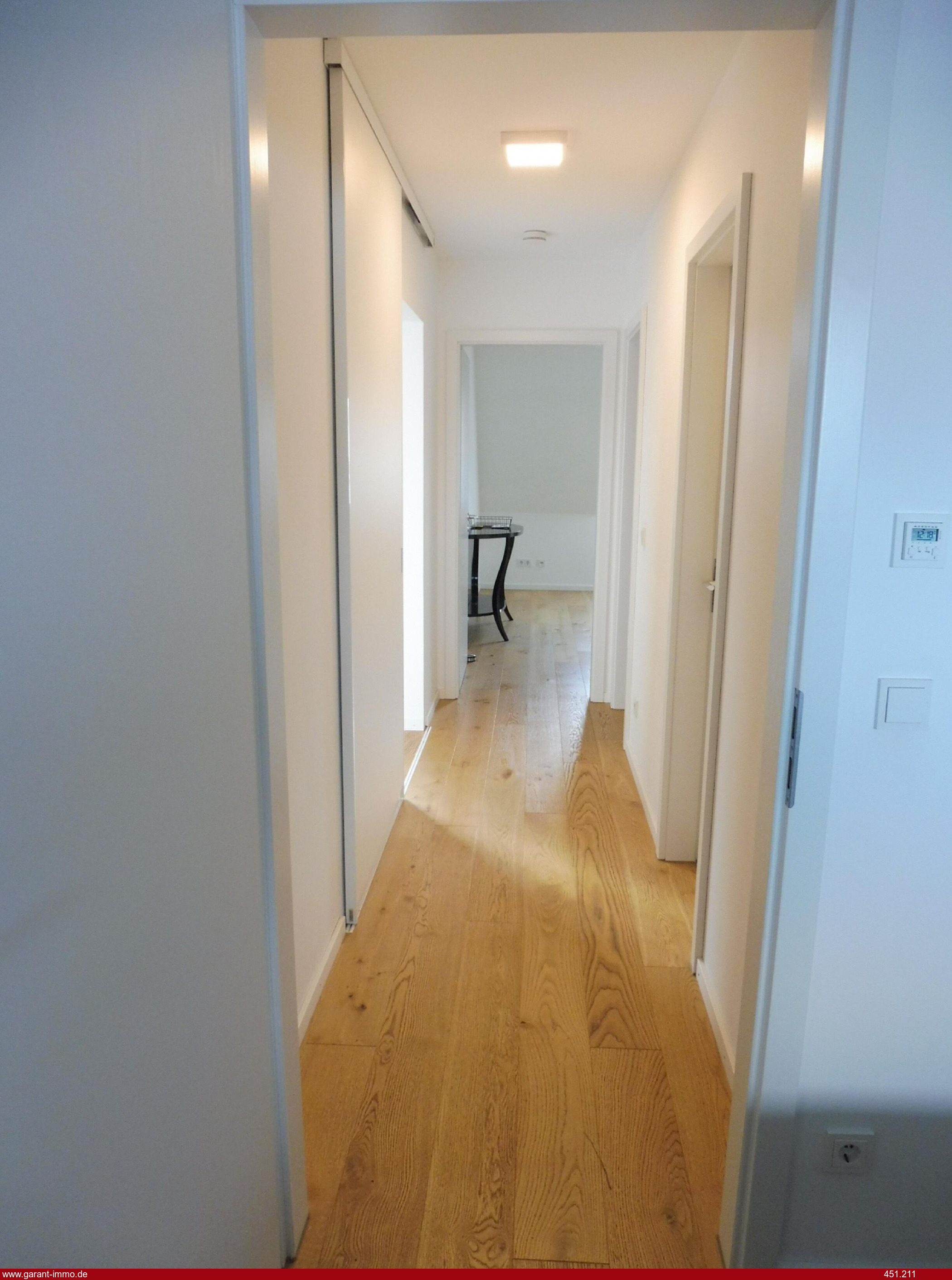 Die Maisonettewohnung wurde Ende 2015 bezogen (Erstbezug) und befindet sich in einem Neubau mit 22 Wohnungen. Zur Wohnung gehört ein Pkw-Stellplatz in der Tiefgarage mit kleinem Abstellraum und einer Wallbox, welche unmittelbar an den Stellplatz angrenzen. Ein Kellerraum ist ebenfalls vorhanden. Mit dem Aufzug gelangt man in das 3. Obergeschoss und über den Laubengang zur Wohnung. Die sehr großzügig gestaltete Wohnung umfasst im unteren Bereich den Wohnungseingang mit offener Wohnküche. Daran schließt sich der Wohnzimmerbereich mit Zugang zur Loggia an, welche sich nach Süden öffnet und den Blick auf die Karlshöhe ermöglicht. Über den Flur erreicht man dann das Arbeitszimmer, das Bad mit Badewanne, das Schlafzimmer und den Hauswirtschaftsraum. Zwischen Wohnküche und Wohnzimmer gelegen, befindet sich die Treppe zum Obergeschoss, welche auf der Galerie endet. Von hier kann man direkt auf die Dachterrasse treten und die morgendliche Sonne bei Gymnastik oder/und Frühstück genießen. Eine Ankleide und das Bad mit Dusche schließen sich unmittelbar an die Galerie an. Eine vom Eigentümer eingebaute raumhohe Spiegelschiebetür trennt die Ankleide vom Schlafzimmer. Von hier ist ein direkter Zugang zur Dachterrasse möglich.