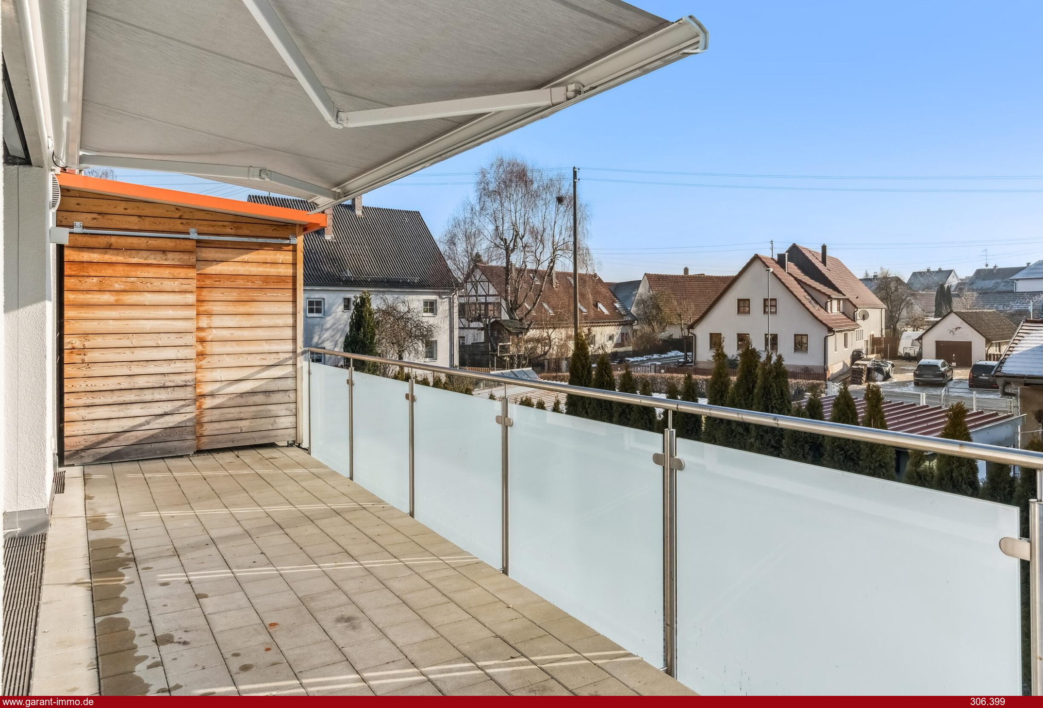 Ein besonderes Highlight ist der großzügige Balkon, der sowohl vom Wohnzimmer als auch vom Schlafzimmer aus zugänglich ist. Dank der elektrischen Markise lässt sich der Außenbereich Richtung Süden flexibel beschatten und bietet zu jeder Tageszeit einen angenehmen Platz zum Entspannen. Zusätzlich steht Ihnen auf dem Balkon ein praktischer Abstellraum zur Verfügung, der wertvollen Stauraum für alles bietet, was nicht täglich benötigt wird.