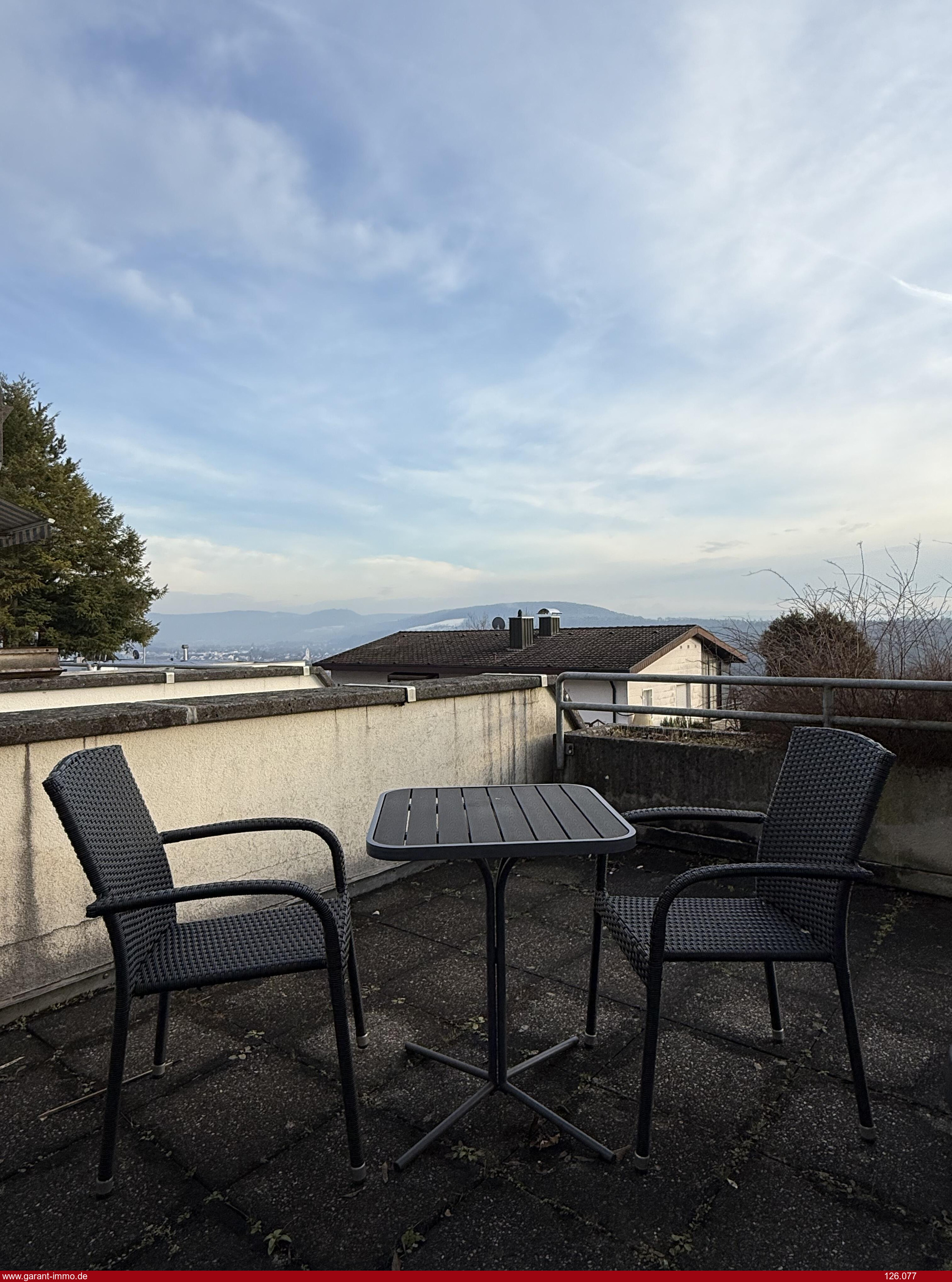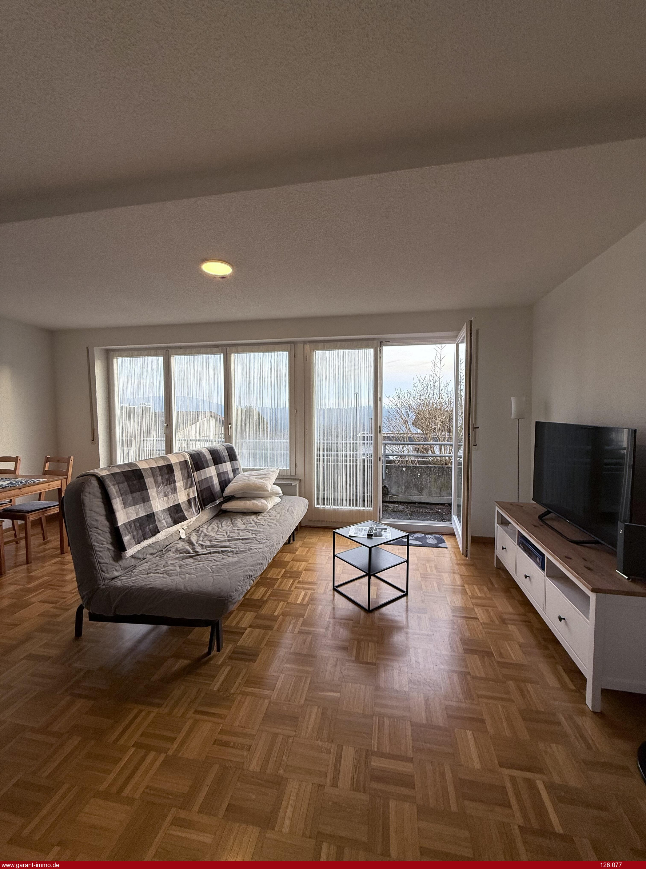 Vom Wohnzimmer gelangen Sie direkt auf den Balkon und den privaten Freisitz, von wo Sie je nach Wetterlage tolle Alpensicht, Ruhe und Entspannung genießen können.