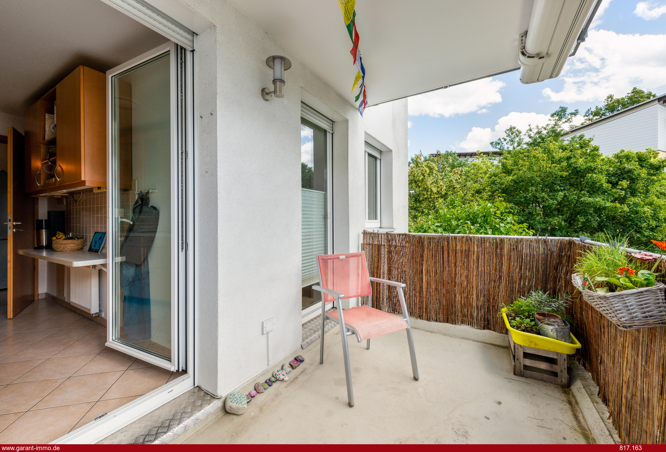 Der große Balkon ist das absolute Highlight. Im Sommer sorgt hier die elektrische Markise für angenehmen Schatten und ein Windschutz für Gemütlichkeit.